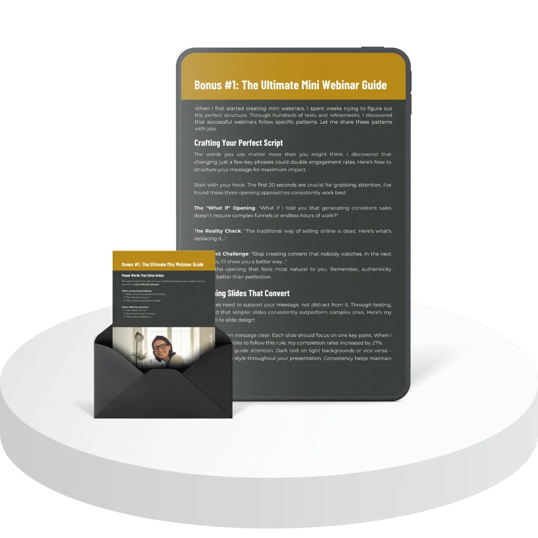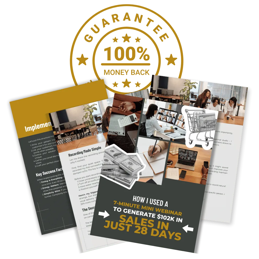 You’ll receive the complete 7-Minute Mini-Webinar Framework, including step-by-step guidance, done-for-you scripts, easy setup instructions, and access to exclusive bonuses like templates, checklists, and our VIP community.